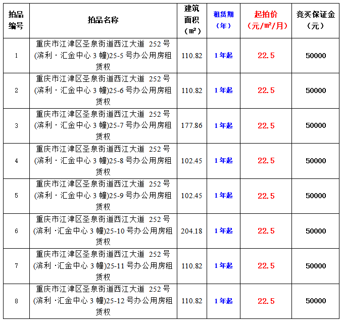 1、重慶市江津區(qū)圣泉街道西江大道 252號(濱利·匯金中心3幢) 25 層辦公用房8間租賃權(quán),建筑面積:102.45㎡-204.18㎡,租賃權(quán)起拍價:22.5元/㎡/月/間,競買保證金:5萬元/間。