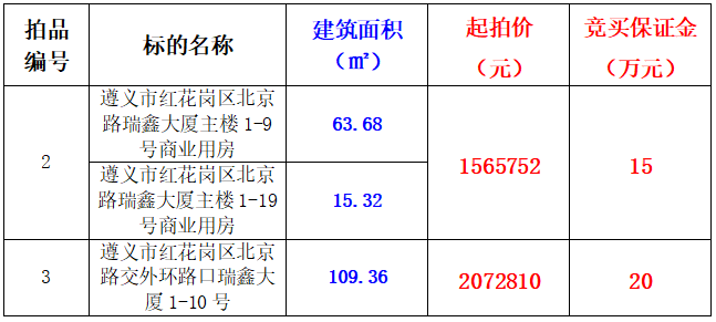 2、遵義市紅花崗區(qū)北京路瑞鑫大廈主樓1-9、1-19號商業(yè)用房(整體拍賣),建筑面積:79㎡,起拍價(jià):1565752元,競買保證金:15萬元;