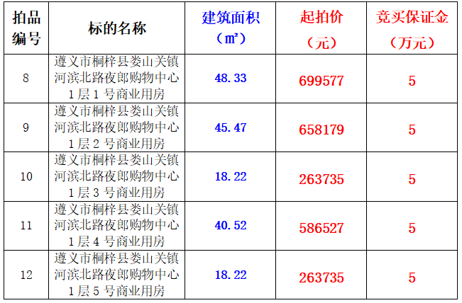 8、遵義市桐梓縣婁山關(guān)鎮(zhèn)河濱北路夜郎購物中心1層1號商業(yè)用房,建筑面積:48.33㎡,起拍價(jià):699577元,競買保證金:5萬元;